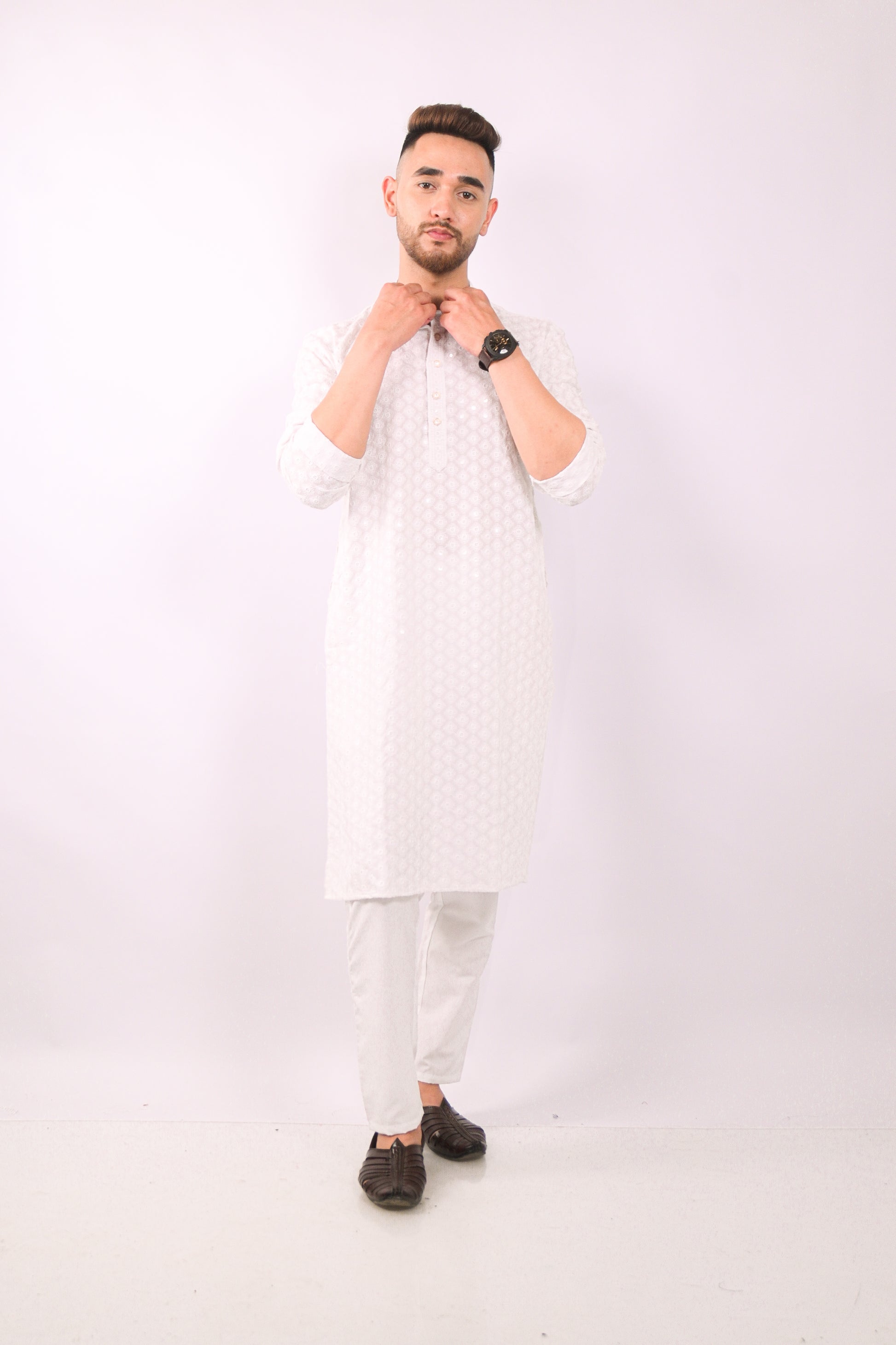 Discover timeless elegance with the warm white chikankari embroidered kurta set for men. Adorned with intricate chikankari embroidery, this kurta set showcases craftsmanship with a modern twist. Complete the look with slim-fit trousers and juttis. For a polished finish, add a tailored Nehru jacket or a subtle, elegant watch